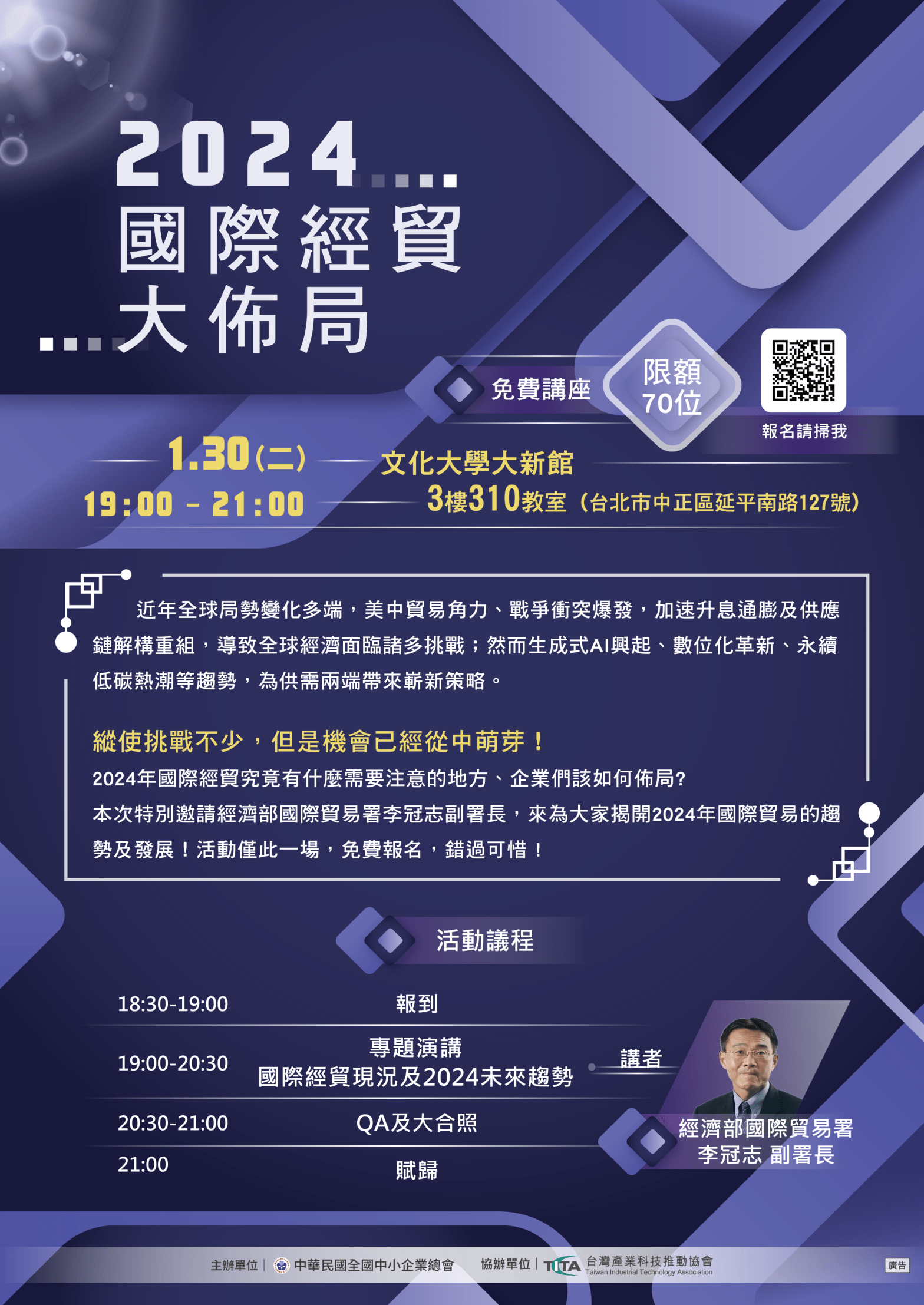 19:00-20:30 【專題演講】國際經貿現況及2024未來趨勢