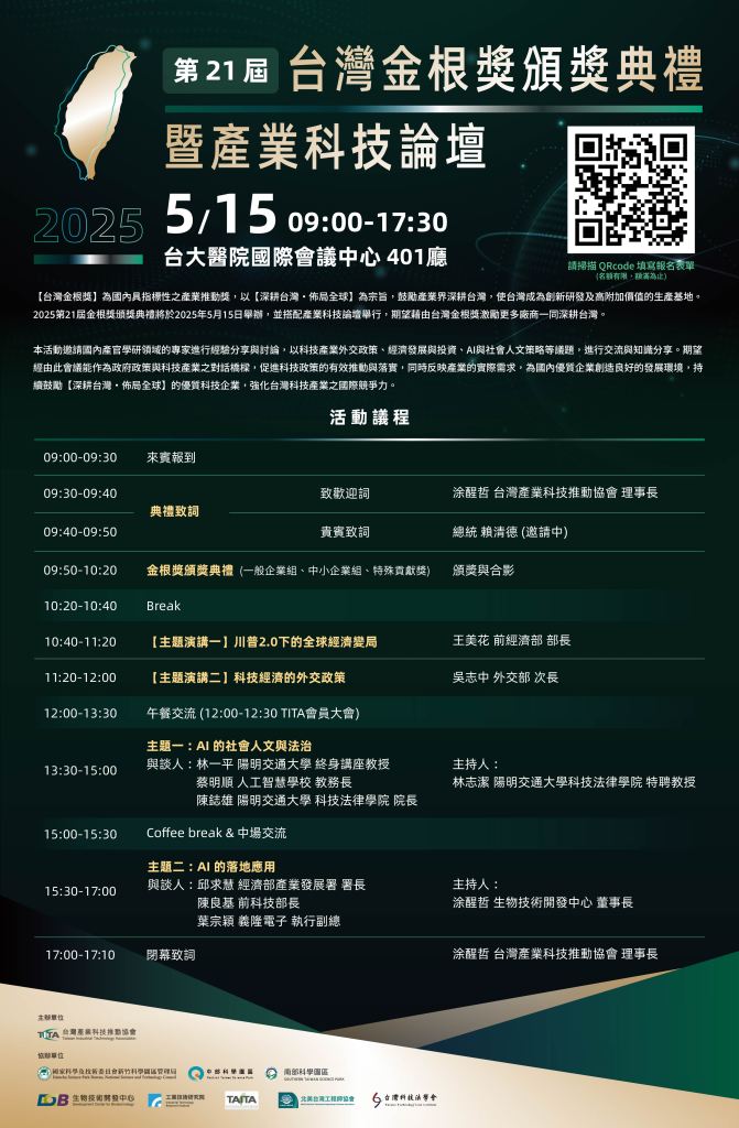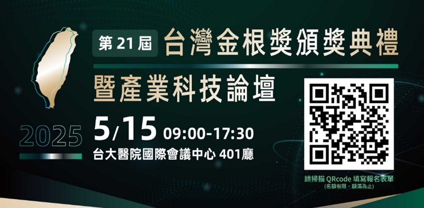 2025 5月15日第21屆台灣金根獎頒獎典禮暨產業科技論壇 報名 分類:台灣產業科技推動協會(TITA)2025 年 5 月 2 日2025 年 5 月 5 日發表於台灣金根獎,未分類,活動訊息 報名連結 https://reurl.cc/paK4Ll (名額有限 額滿為止) 分享此文: 分享到 X(在新視窗中開啟) X 分享到 Facebook(在新視窗中開啟) Facebook 喜歡 正在載入... 相關