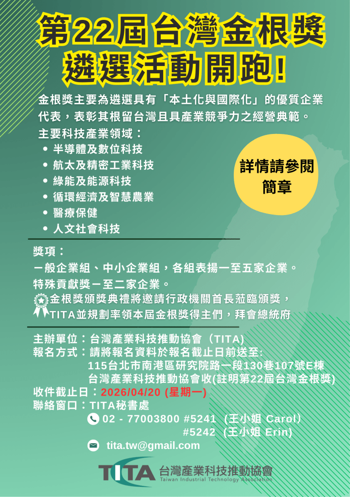 簡章下載 https://reurl.cc/NNWo0p 第 22 屆台灣金根獎簡章,也歡迎轉知分享。