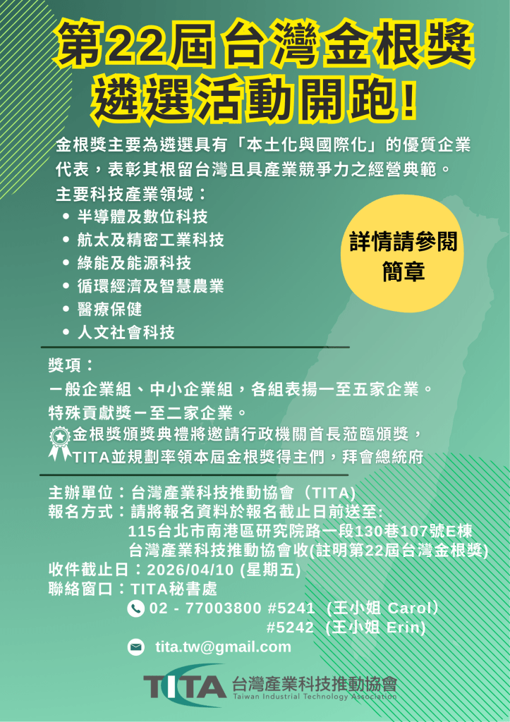 簡章下載 https://reurl.cc/NNWo0p 第 22 屆台灣金根獎簡章,也歡迎轉知分享。